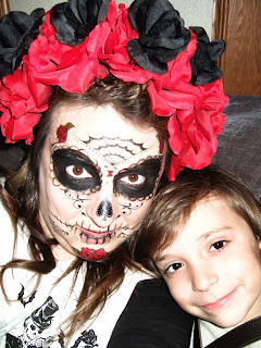 My costume is a day of the dead skull. Part of it's tattoos from Spirit Halloween and the other part I used eyeliner.